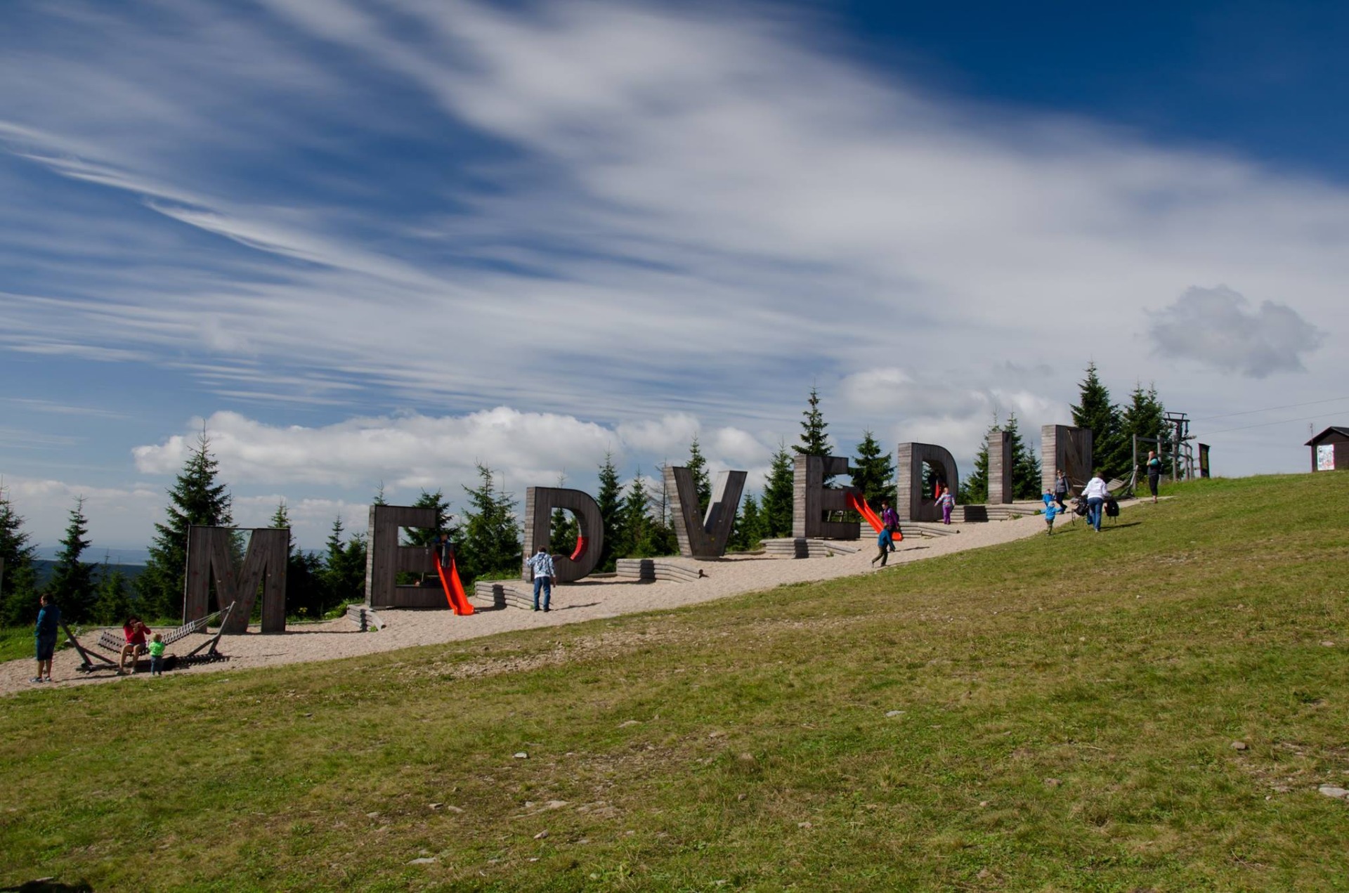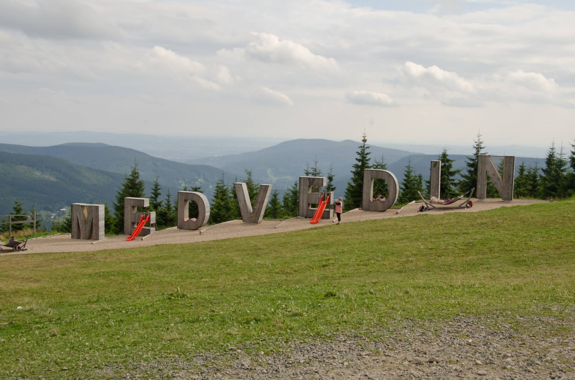 Krásná příroda, krajina, po chvíli už nás vítal nápis Medvědín. Dřevěná písmena s prolejzačkami pro děti. Šli jsme vrátit karty na jízdenky a koupili jsme si turistické vizitky, které sbíráme. Bylo vidět i na druhou stranu Špindlu na sv. Petra. Pro děti zde bylo plno prolejzaček, skluzavek, bagrů. Když jsme se vyblbli, dali jsme se na cestu zpět do Mísečků. Cesta byla kamenná, s rozumným klesáním. Když jsme došli do lesa, vzali jsme to nějakou zkratkou, která opět stála za to. Další den jsme opět vyrazili na Medvědín, ale tentokrát pěšky, po silnici. Byla to nejlepší cesta, kterou jsme našli. Na vrcholu jsme si dali kávu a opalovali jsme se na sluníčku. Cestou na zpět jsme si to chtěli trošku zkrátit, tak jsem se rozhodli jít po sjezdovce dolu, což byla největší hloupost, kterou jsme udělali.